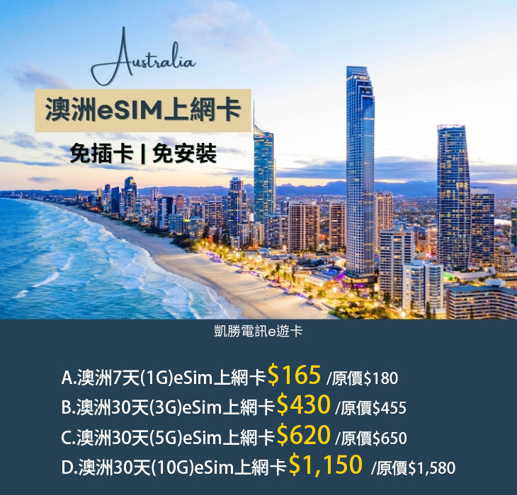 只要165元起,即可享有【澳洲eSim上網卡】7天(1G)/30天(3G/5G/10G)高速上網,免換卡〈含澳洲A.7天(1G)/B.30天(3G)/C.30天(5G)/D.30天(10G)eSIM上網卡〉