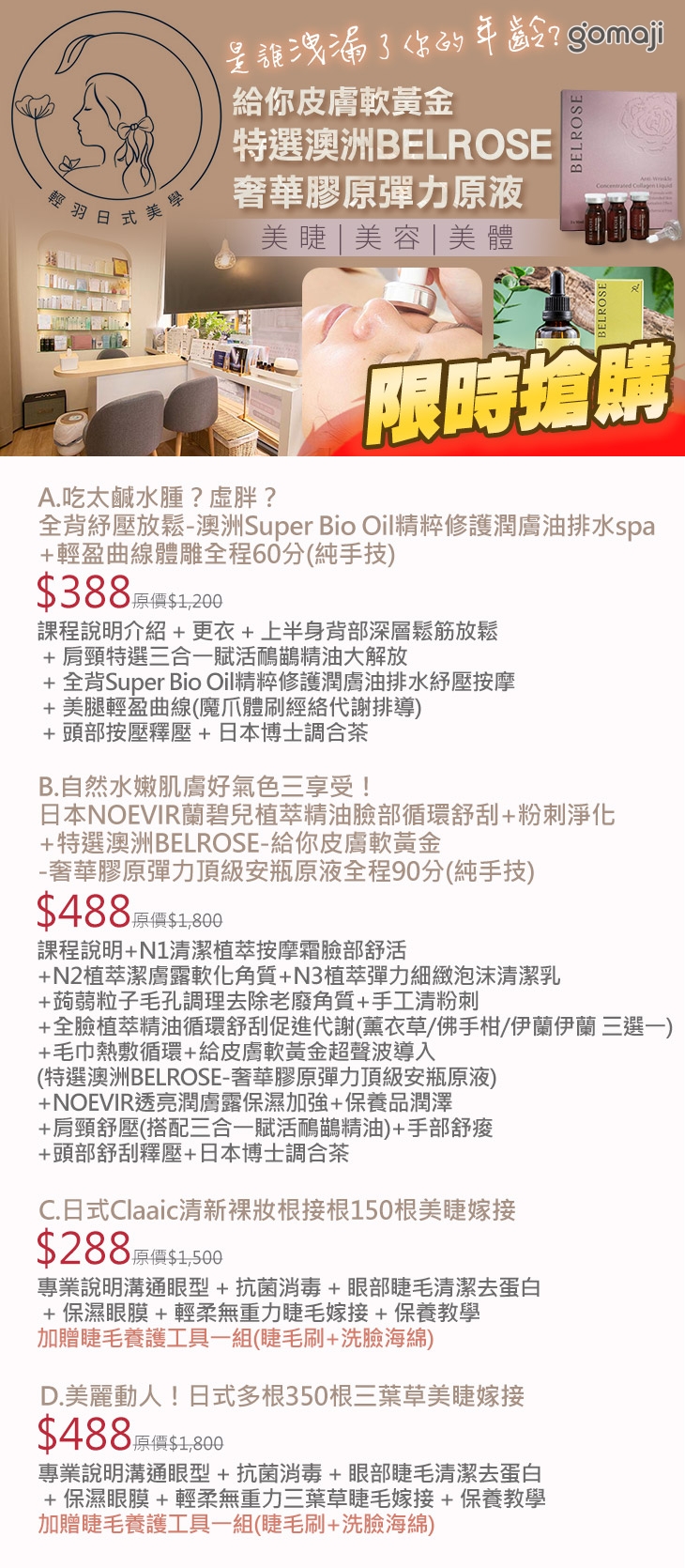 A.吃太鹹水腫?虛胖?全背紓壓放鬆-澳洲Super Bio Oil精粹修護潤膚油排水spa+輕盈曲線體雕全程60分(純手技) / B.自然水嫩肌膚好氣色三享受!日本NOEVIR蘭碧兒植萃精油臉部循環舒刮+粉刺淨化+特選澳洲BELROSE-給你皮膚軟黃金-奢華膠原彈力頂級安瓶原液全程90分(純手技) / C.日式Claaic清新裸妝根接根150根美睫嫁接 / D.美麗動人!日式多根350根三葉草美睫嫁接