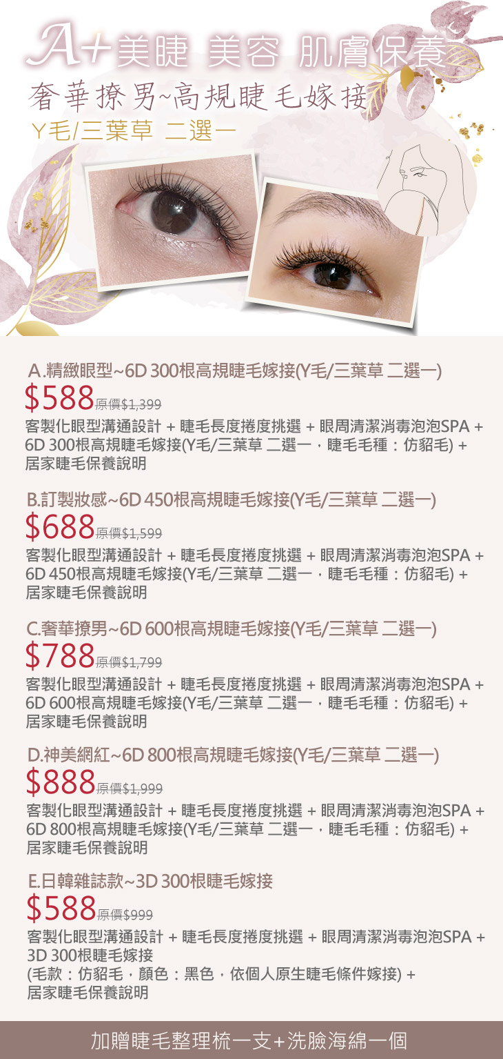 A.精緻眼型~6D 300根高規睫毛嫁接(Y毛/三葉草 二選一) / B.訂製妝感~6D 450根高規睫毛嫁接(Y毛/三葉草 二選一) / C.奢華撩男~6D 600根高規睫毛嫁接(Y毛/三葉草 二選一) / D.神美網紅~6D 800根高規睫毛嫁接(Y毛/三葉草 二選一) / E.日韓雜誌款~3D 300根睫毛嫁接