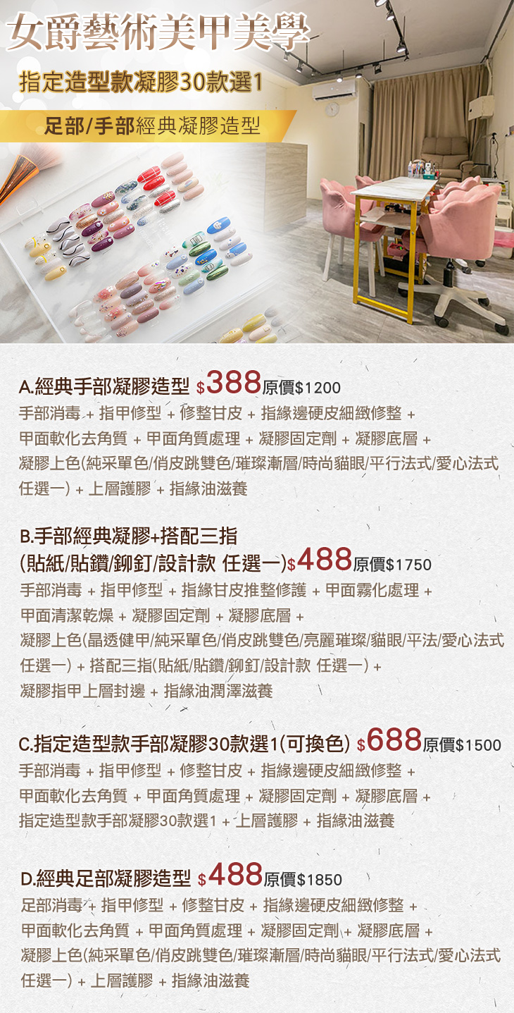 A.經典手部凝膠造型 / B.手部經典凝膠+搭配三指(貼紙/貼鑽/鉚釘/設計款 任選一) / C.指定造型款手部凝膠30款選1(可換色) / D.經典足部凝膠造型