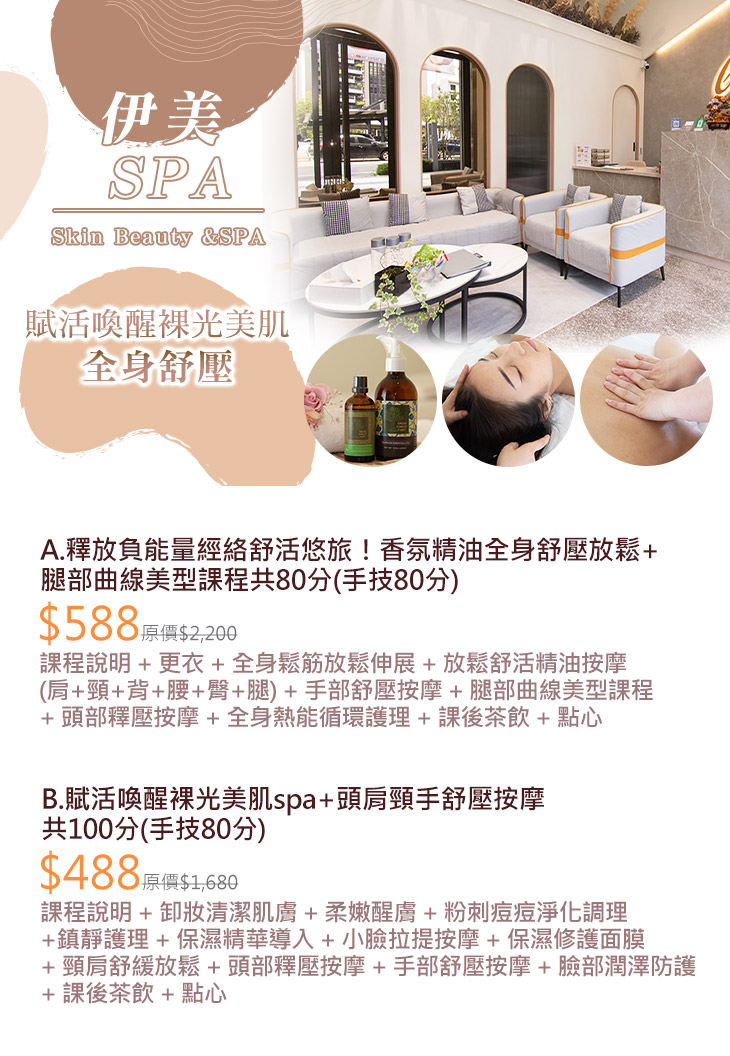 A.釋放負能量經絡舒活悠旅!香氛精油全身舒壓放鬆+腿部曲線美型課程共80分(手技80分) / B.賦活喚醒裸光美肌spa+頭肩頸手舒壓按摩共100分(手技80分)
