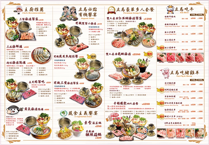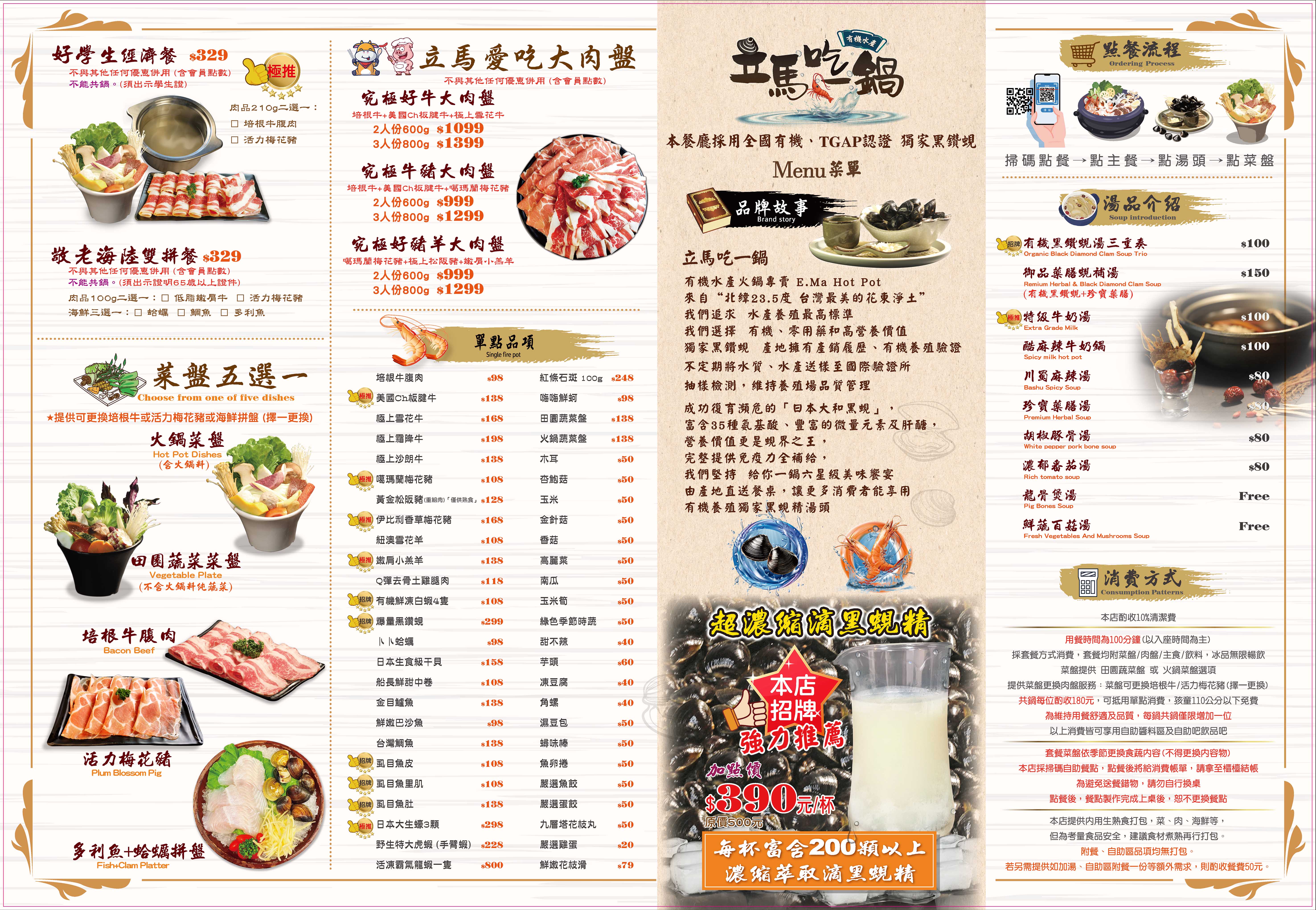 【立馬吃一鍋,有機水產鍋物】擁有自己的水產養殖場,其養殖出來的水產,品質純淨,給予消費者食安上的承諾。說到有機水產,便不能不提到有機三寶-招牌日本黑蜆、有機無刺的虱目魚與白蝦,良好的品質,在鍋湯中不斷燉煮,自然、甘醇、鮮甜的美味,滲入滴滴湯水當中,創造韻味無窮的湯底,保證讓您一嚐驚艷、夜夜難忘、回味無窮!