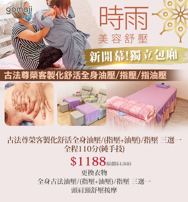 〈更換衣物 + 全身古法油壓/(指壓+油壓)/指壓 三選一 + 頭肩頸舒壓按摩〉