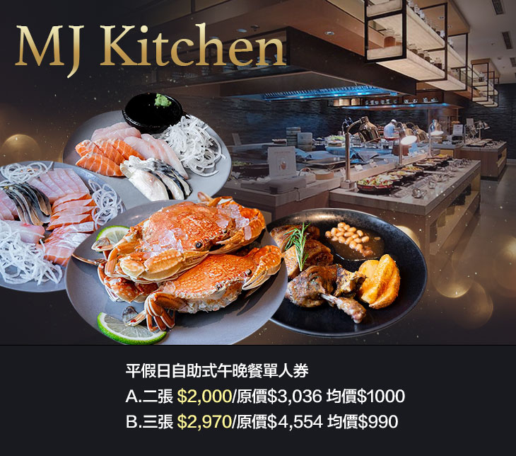 寬敞舒適的MJ Kitchen,是聚餐的極佳選擇!開放式廚房由廚師們現場為您呈現特色精緻料理,除了有現切肉品可品嚐,還有鮮蝦、生魚片等多元珍饌海味,鮮味十足,讓人食指大動、垂涎不已!巧妙結合中西各式料理,在您享用完餐點後,讓甜點水果、冰淇淋為您畫下完美的句點吧!