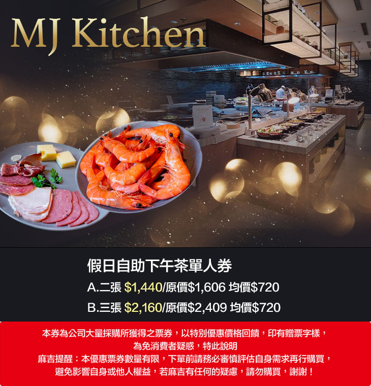 寬敞舒適的MJ Kitchen,是聚餐的極佳選擇!開放式廚房由廚師們現場為您呈現特色精緻料理,除了有現切肉品可品嚐,還有鮮蝦、生魚片等多元珍饌海味,鮮味十足,讓人食指大動、垂涎不已!巧妙結合中西各式料理,在您享用完餐點後,讓甜點水果、冰淇淋為您畫下完美的句點吧!