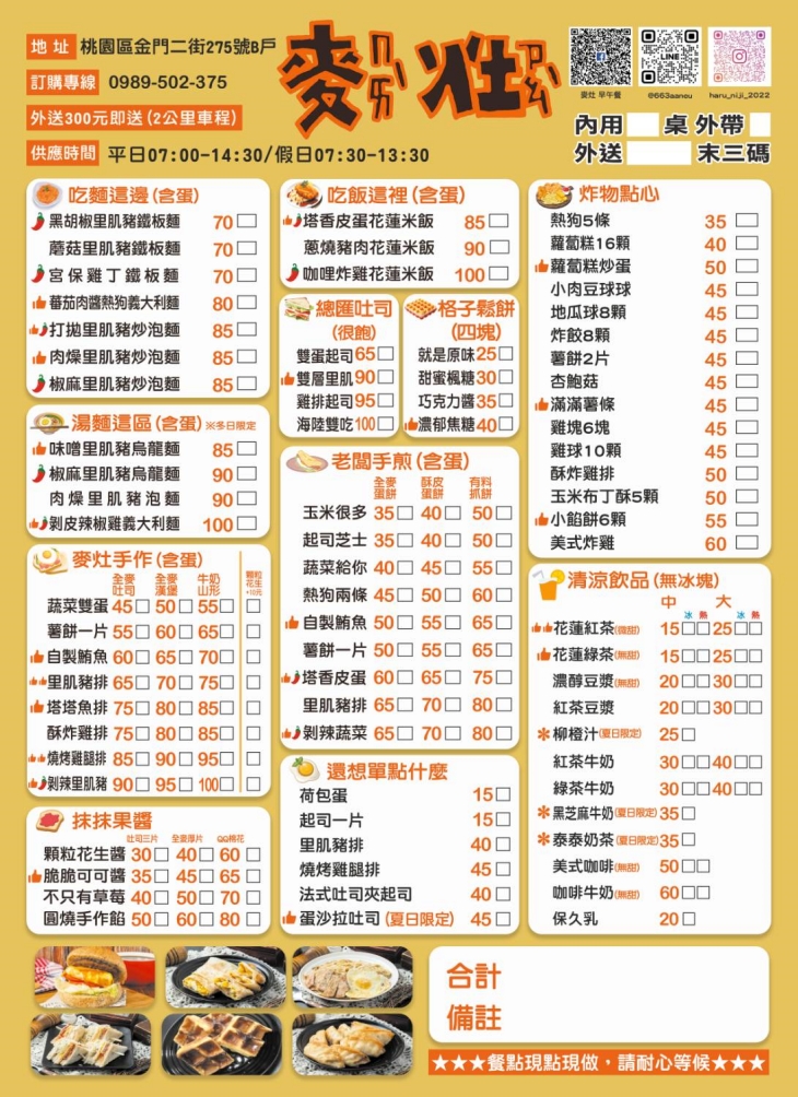 店家堅持使用新鮮的食材,每樣餐點現點現做,讓所有顧客可以嚐到熱騰騰的美味餐點!而且店家不只關注美味程度,也注重健康,精心設計了多種口味的全麥選項,讓可口與天然結合!不論你是追求健康飲食者,還是熱愛探索美食的人,都可以在這裡滿足到你的胃口與需求!一起享受美好的早午餐點吧!