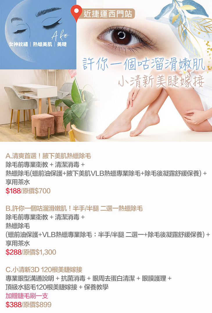 A.清爽首選!腋下美肌熱蠟除毛 / B.許你一個咕溜滑嫩肌!半手/半腿 二選一熱蠟除毛 / C.小清新3D 120根美睫嫁接
