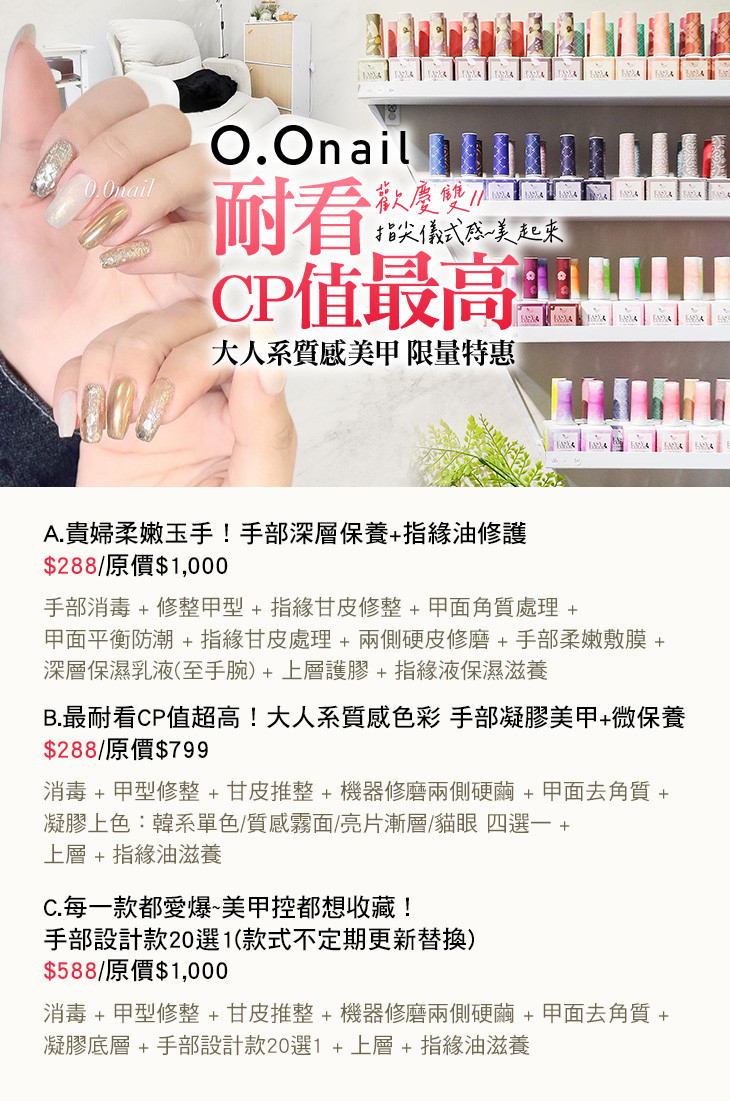 A.貴婦柔嫩玉手!手部深層保養+指緣油修護 / B.最耐看CP值超高!大人系質感色彩 手部凝膠美甲+微保養 / C.每一款都愛爆~美甲控都想收藏!手部設計款20選1(款式不定期更新替換)