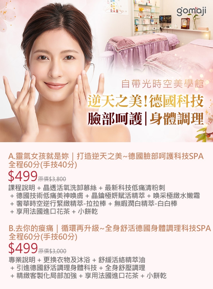 A.靈氣女孩就是妳|打造逆天之美~德國臉部呵護科技SPA全程60分(手技40分) / B.去你的痠痛|循環再升級~全身舒活德國身體調理科技SPA全程60分(手技60分)