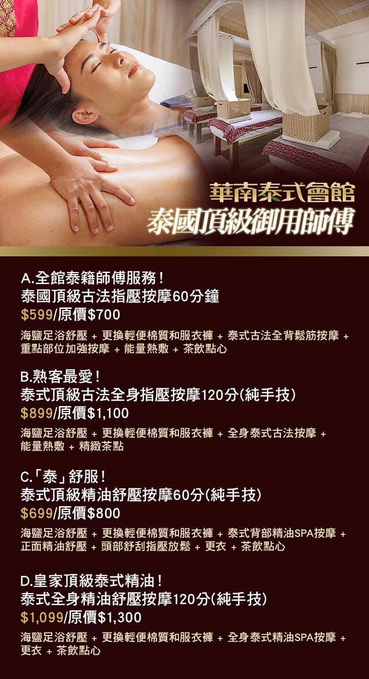 A.全館泰籍師傅服務!泰國頂級古法指壓按摩60分鐘