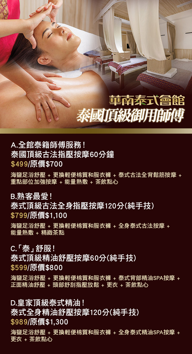 A.全館泰籍師傅服務!泰國頂級古法指壓按摩60分鐘