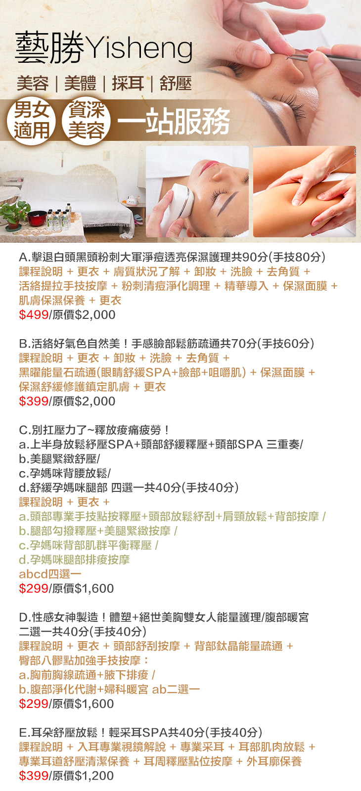 A.擊退白頭黑頭粉刺大軍淨痘透亮保濕護理共90分(手技80分) / B.活絡好氣色自然美!手感臉部鬆筋疏通共70分(手技60分) / C.別扛壓力了~釋放痠痛疲勞!a.上半身放鬆紓壓SPA+頭部舒緩釋壓+頭部SPA 三重奏/b.美腿緊緻舒壓/c.孕媽咪背腰放鬆/d.舒緩孕媽咪腿部 四選一共40分(手技40分) / D.性感女神製造!體塑+絕世美胸雙女人能量護理/腹部暖宮 二選一共40分(手技40分) / E.耳朵舒壓放鬆!輕采耳SPA共40分(手技40分)