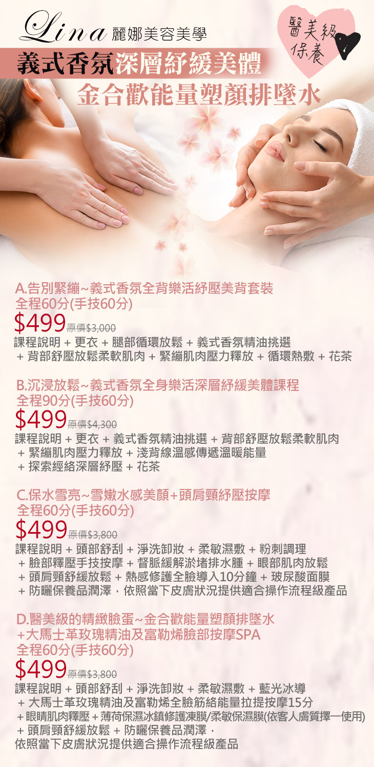 A.告別緊繃~義式香氛全背樂活紓壓美背套裝全程60分(手技60分) / B.沉浸放鬆~義式香氛全身樂活深層紓緩美體課程全程90分(手技60分) / C.保水雪亮~雪嫩水感美顏+頭肩頸紓壓按摩全程60分(手技60分) / D.醫美級的精緻臉蛋~金合歡能量塑顏排墜水+大馬士革玫瑰精油及富勒烯臉部按摩SPA全程60分(手技60分)