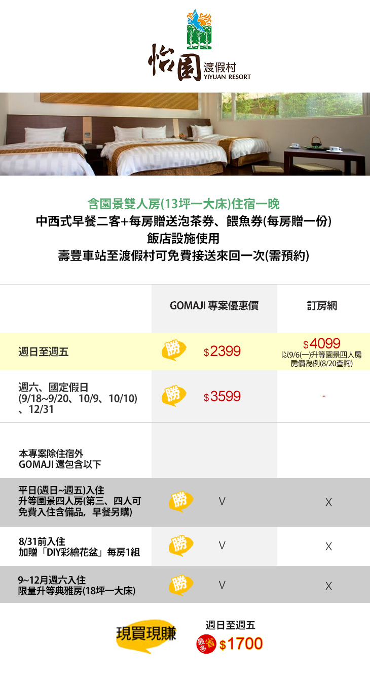 ★ 平日(週日~週五)入住升等園景四人房,第三、四人可免費入住含備品,早餐另購。