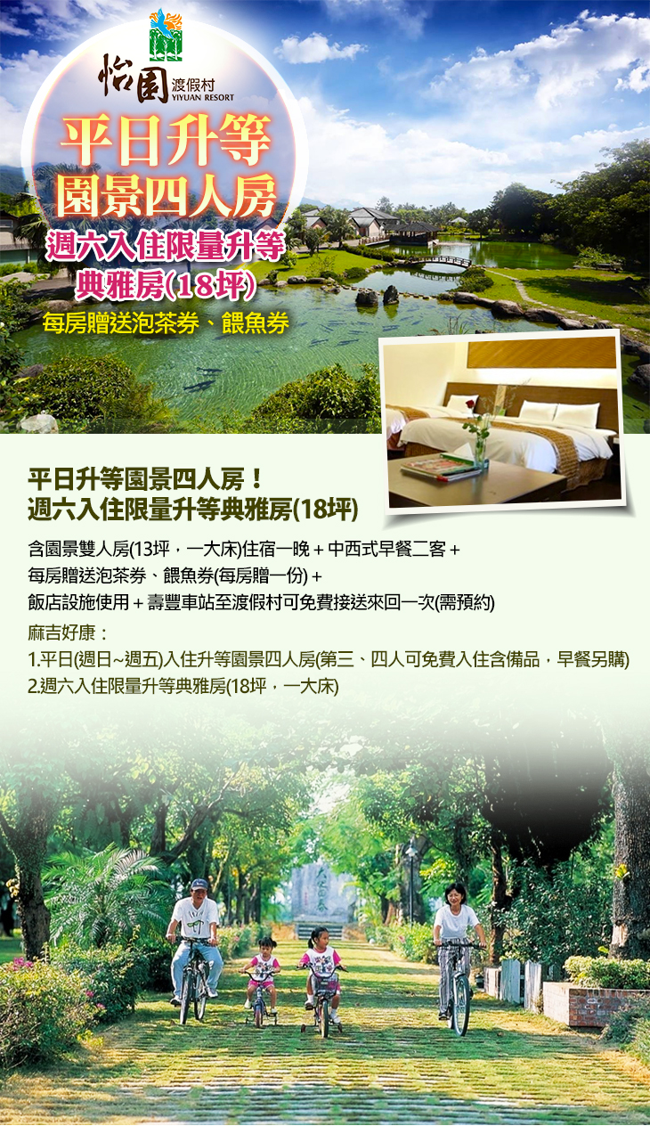 ★ 平日(週日~週五)入住升等園景四人房,第三、四人可免費入住含備品,早餐另購。