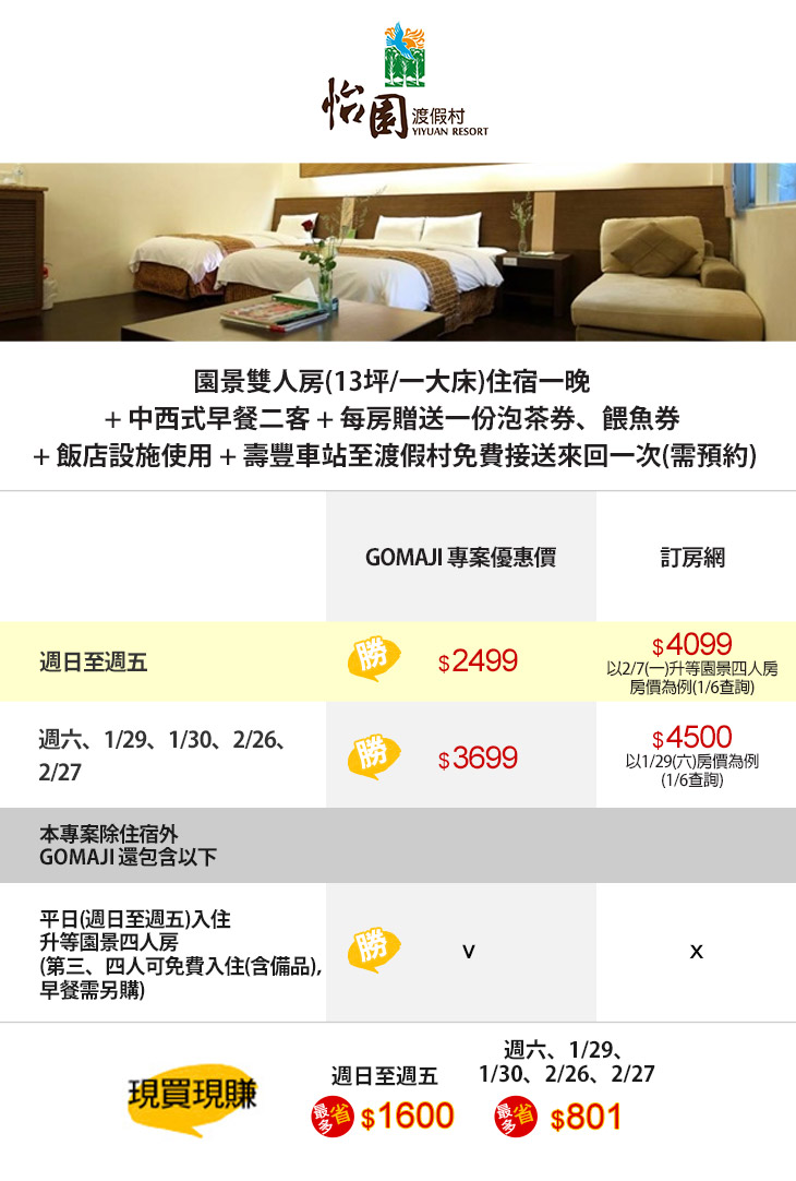★ 平日(週日至週五)入住升等園景四人房,第三、四人可免費入住含備品,早餐另購。
