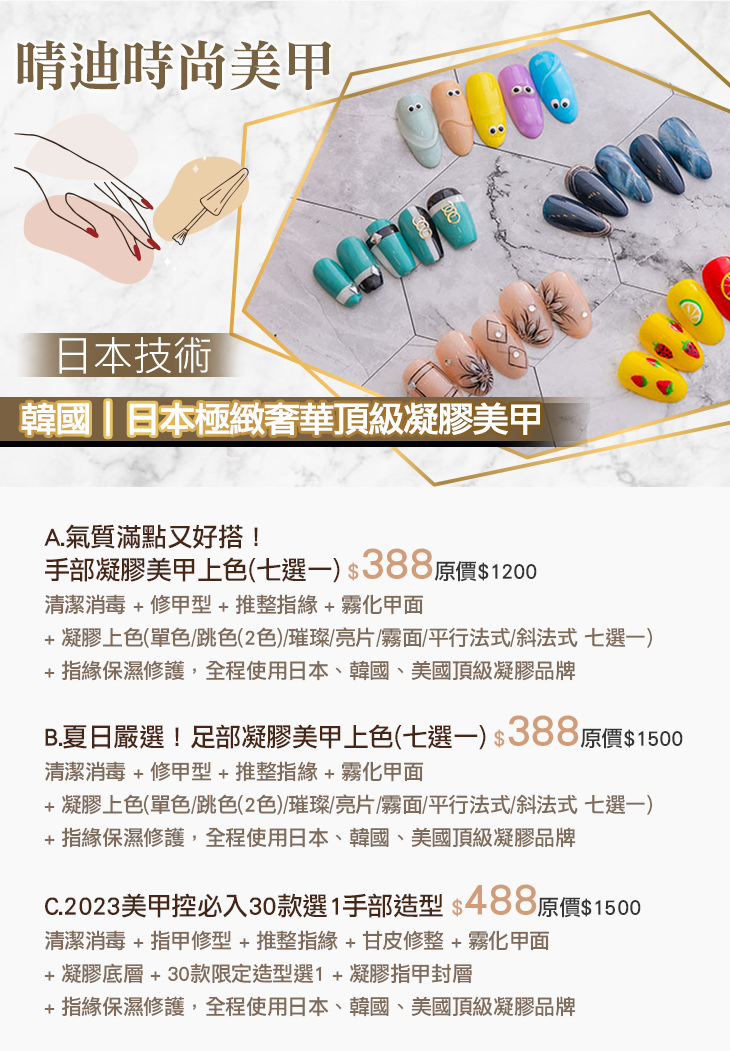A.氣質滿點又好搭!手部凝膠美甲上色(七選一) / B.夏日嚴選!足部凝膠美甲上色(七選一) / C.2023美甲控必入30款選1手部造型