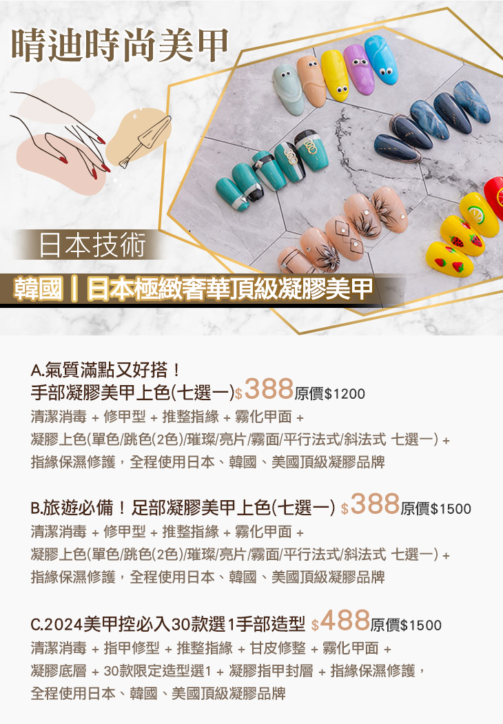 A.氣質滿點又好搭!手部凝膠美甲上色(七選一) / B.旅遊必備!足部凝膠美甲上色(七選一) / C.2024美甲控必入30款選1手部造型