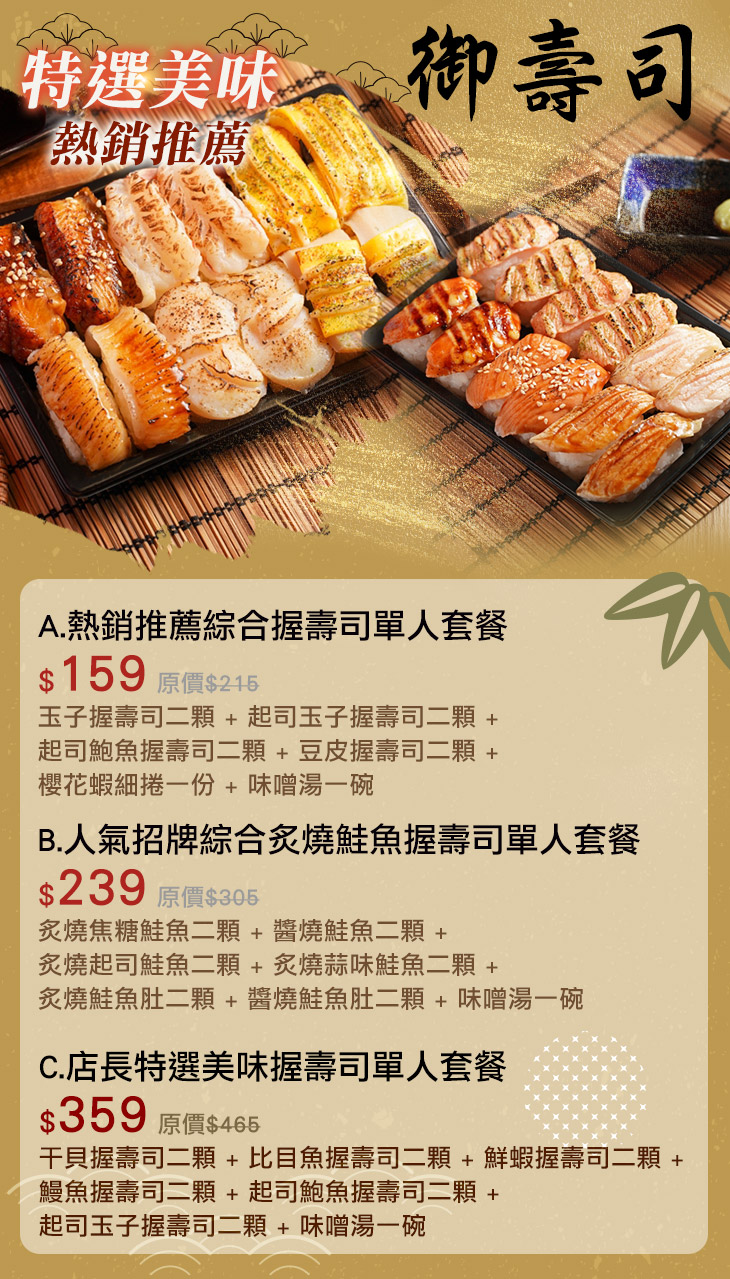 主打真材實料、選擇多元的日式壽司,好吃的關鍵在於嚴選上好食材、香Q米飯,搭配職人的嫻熟手藝及俐落刀工,將食材最純粹的美味展現得淋漓盡致,以精緻的姿態完美獻上給您,每種不同口味的壽司都是師傅用心手作的成品,皆飽含匠心巧思、豐富口感,保證讓您吃得飽足、更直呼幸福~愛吃壽司的麻吉們,千萬不要錯過啦!