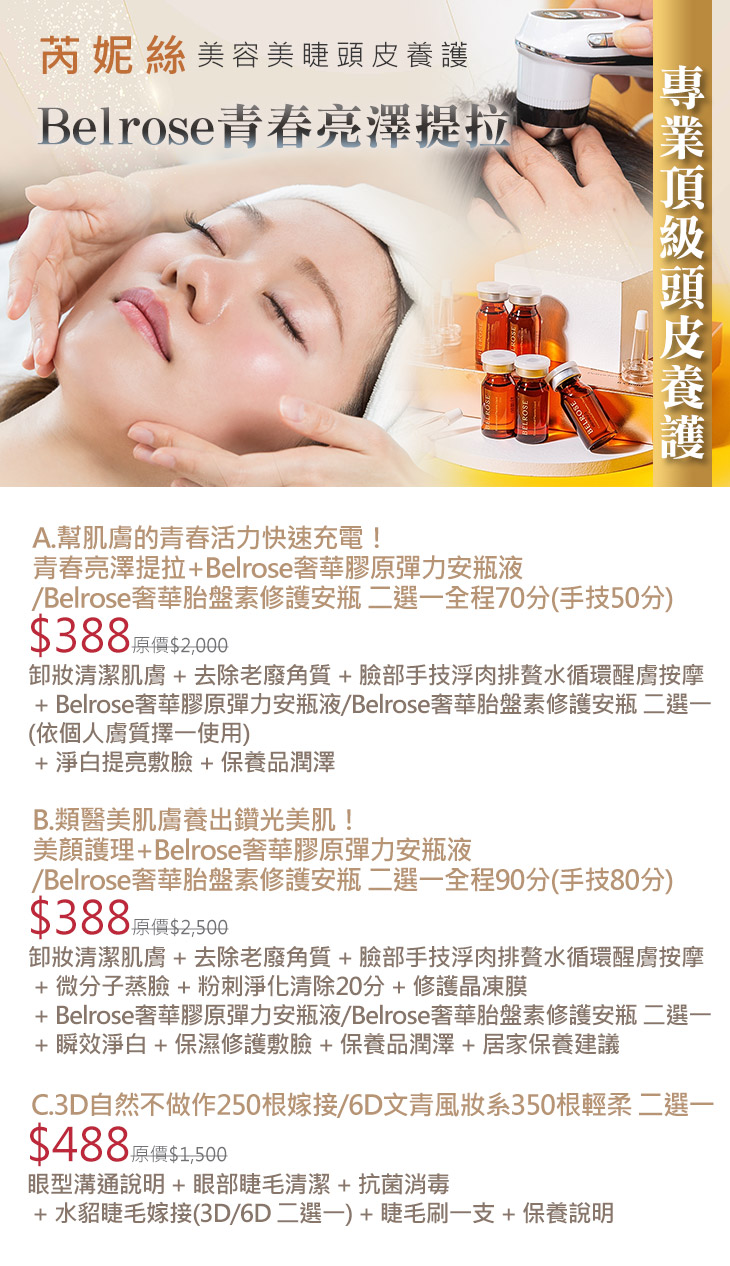 A.幫肌膚的青春活力快速充電!青春亮澤提拉+Belrose奢華膠原彈力安瓶液/Belrose奢華胎盤素修護安瓶 二選一全程70分(手技50分) / B.類醫美肌膚養出鑽光美肌!美顏護理+Belrose奢華膠原彈力安瓶液/Belrose奢華胎盤素修護安瓶 二選一全程90分(手技80分) / C.3D自然不做作250根嫁接/6D文青風妝系350根輕柔 二選一