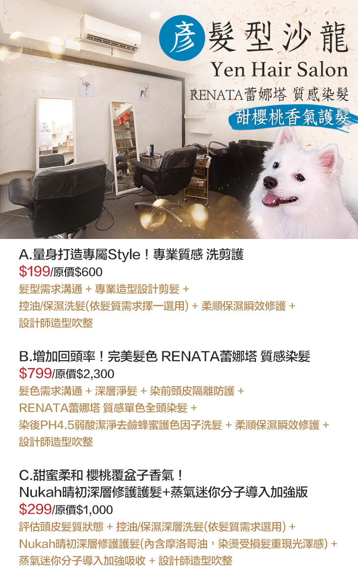 A.量身打造專屬Style!專業質感 洗剪護 / B.增加回頭率!完美髮色 RENATA蕾娜塔 質感染髮 / C.甜蜜柔和 櫻桃覆盆子香氣!Nukah晴初深層修護護髮+蒸氣迷你分子導入加強版