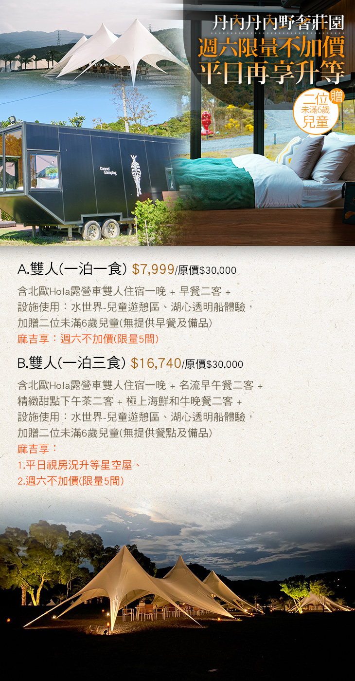 ★ 加贈二位未滿6歲兒童(無提供餐點及備品),B方案麻吉再享:平日視房況升等星空屋,盡情享受寧靜夜晚與璀璨星空!