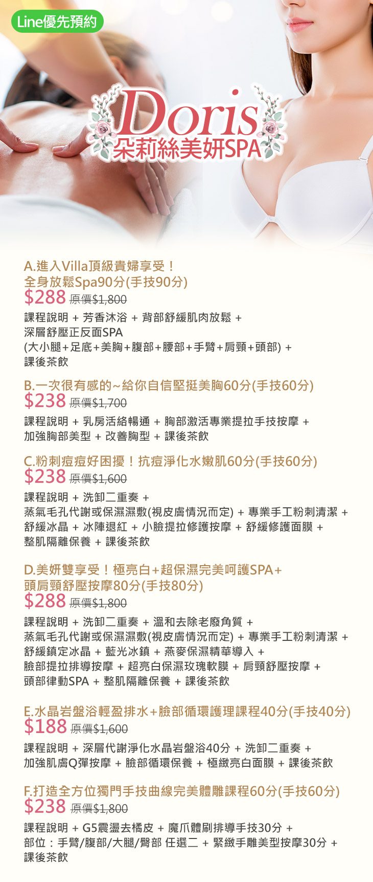 A.進入Villa頂級貴婦享受!全身放鬆Spa90分(手技90分) / B.一次很有感的~給你自信堅挺美胸60分(手技60分) / C.粉刺痘痘好困擾!抗痘淨化水嫩肌60分(手技60分) / D.美妍雙享受!極亮白+超保濕完美呵護SPA+頭肩頸舒壓按摩80分(手技80分) / E.水晶岩盤浴輕盈排水+臉部循環護理課程40分(手技40分) / F.打造全方位獨門手技曲線完美體雕課程60分(手技60分)