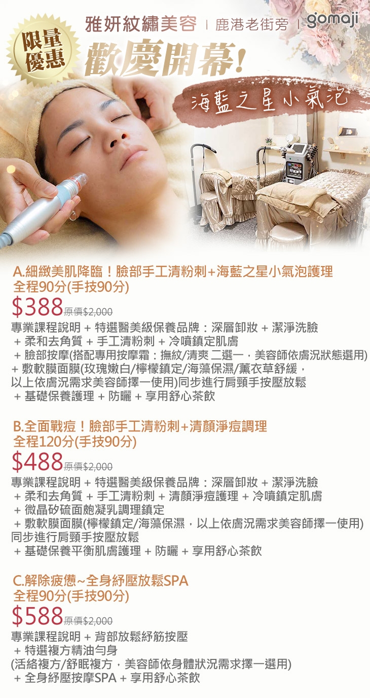 A.細緻美肌降臨!臉部手工清粉刺+海藍之星小氣泡護理全程90分(手技90分) / B.全面戰痘!臉部手工清粉刺+清顏淨痘調理全程120分(手技90分) / C.解除疲憊~全身紓壓放鬆SPA全程90分(手技90分)