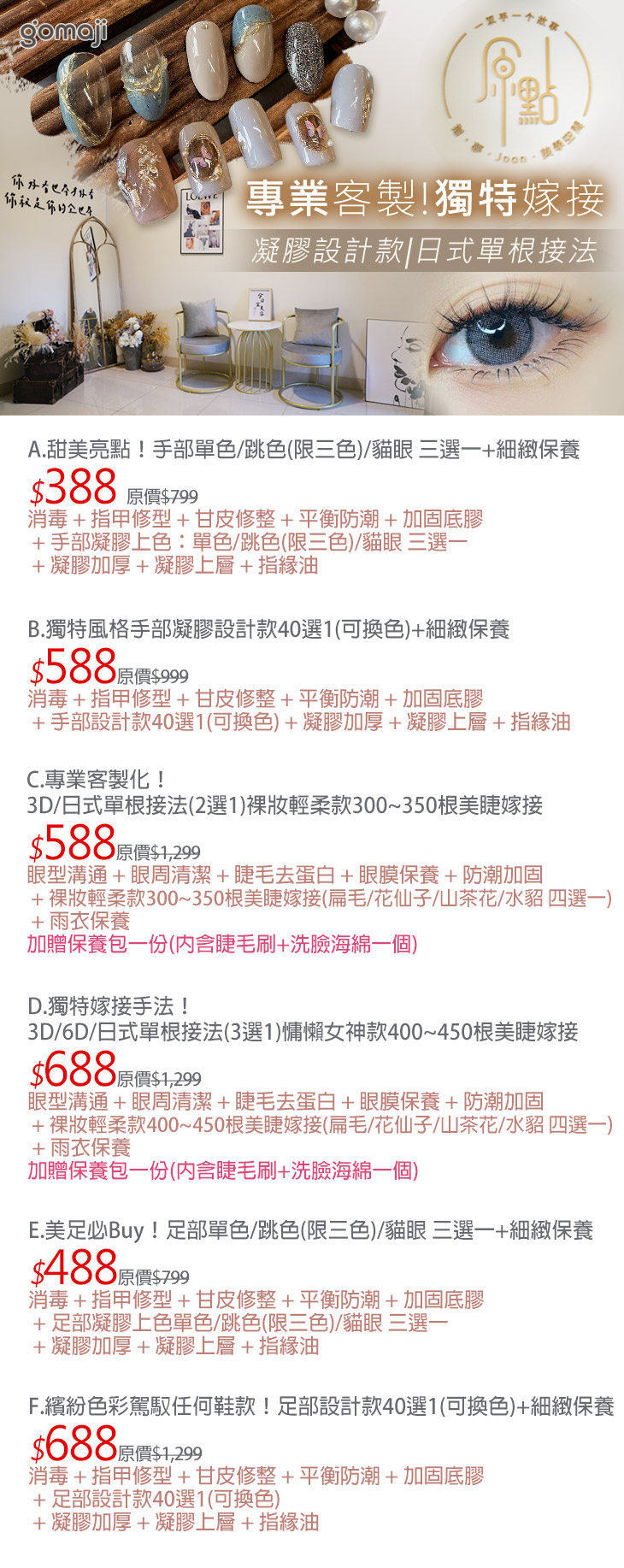 A.甜美亮點!手部單色/跳色(限三色)/貓眼 三選一+細緻保養 / B.獨特風格手部凝膠設計款40選1(可換色)+細緻保養 / C.專業客製化!3D/日式單根接法(2選1)裸妝輕柔款300~350根美睫嫁接 / D.獨特嫁接手法!3D/6D/日式單根接法(3選1)慵懶女神款400~450根美睫嫁接 / E.美足必Buy!足部單色/跳色(限三色)/貓眼 三選一+細緻保養 / F.繽紛色彩駕馭任何鞋款!足部設計款40選1(可換色)+細緻保養