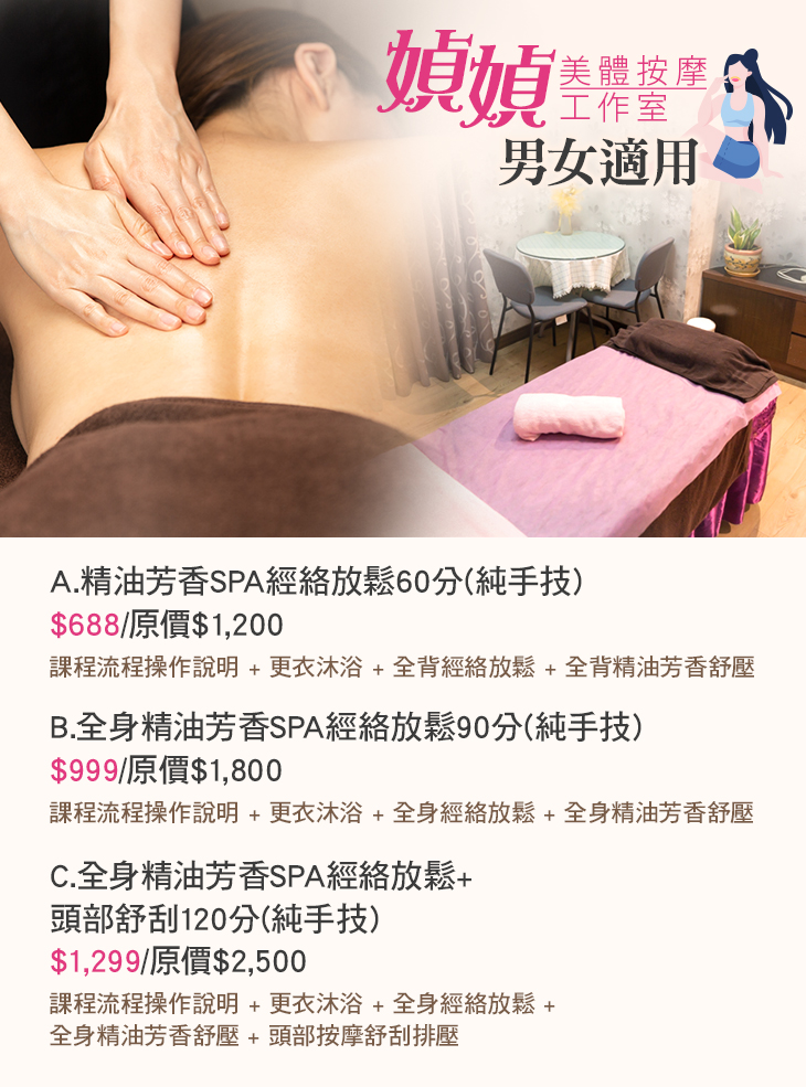A.精油芳香SPA經絡放鬆60分(純手技) / B.全身精油芳香SPA經絡放鬆90分(純手技) / C.全身精油芳香SPA經絡放鬆+頭部舒刮120分(純手技)