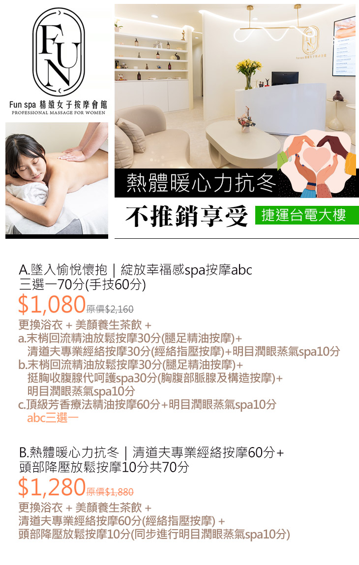 A.墜入愉悅懷抱|綻放幸福感spa按摩 abc三選一70分(手技60分) / B.熱體暖心力抗冬|清道夫專業經絡按摩60分+頭部降壓放鬆按摩10分共70分
