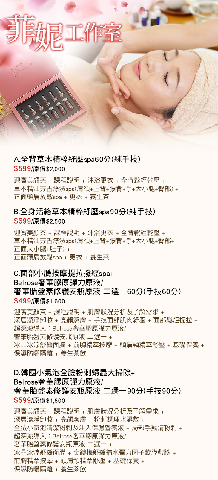 A.全背草本精粹紓壓spa60分(純手技) / B.全身活絡草本精粹紓壓spa90分(純手技) / C.面部小臉按摩提拉撥經spa+Belrose奢華膠原彈力原液/奢華胎盤素修護安瓶原液 二選一60分(手技60分) / D.韓國小氣泡全臉粉刺螨蟲大掃除+Belrose奢華膠原彈力原液/奢華胎盤素修護安瓶原液 二選一90分(手技90分)