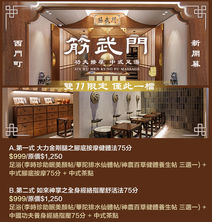 筋武門的按摩是結合中國功夫,研發出自己的一套獨特的[功夫按摩],透過武術的指、掌、拳等的武術招式、巧妙應用在按摩手法上,讓你感受全新舒服的按摩體驗,按摩完就如打通你全身的任督二脈一般,讓你恢復滿滿的元氣。