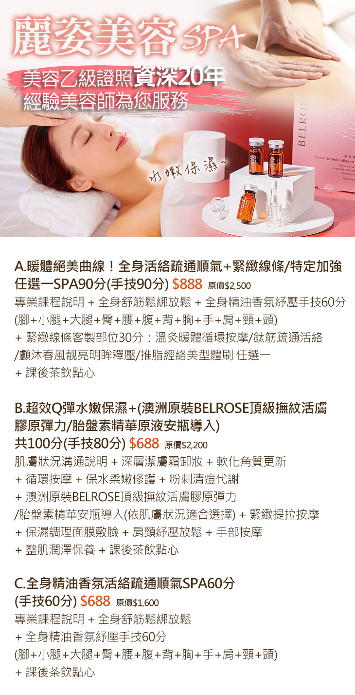 A.暖體絕美曲線!全身活絡疏通順氣+緊緻線條/特定加強 任選一SPA90分(手技90分) / B.超效Q彈水嫩保濕+(澳洲原裝BELROSE頂級撫紋活膚膠原彈力/胎盤素精華原液安瓶導入)共100分(手技80分) / C.全身精油香氛活絡疏通順氣SPA60分(手技60分)