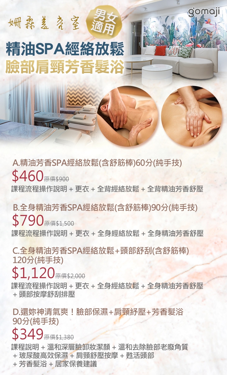 A.精油芳香SPA經絡放鬆(含舒筋棒)60分(純手技) / B.全身精油芳香SPA經絡放鬆(含舒筋棒)90分(純手技) / C.全身精油芳香SPA經絡放鬆+頭部舒刮(含舒筋棒)120分(純手技) / D.還妳神清氣爽!臉部保濕+肩頸紓壓+芳香髮浴90分(純手技)