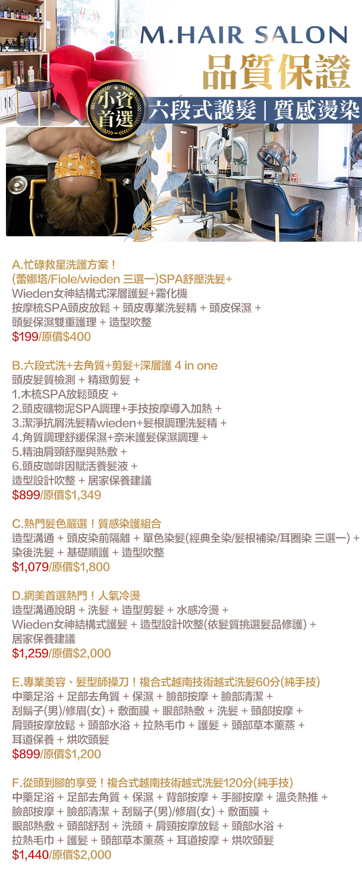A.忙碌救星洗護方案!(蕾娜塔/Fiole/wieden 三選一)SPA舒壓洗髮+Wieden女神結構式深層護髮+霧化機 / B.六段式洗+去角質+剪髮+深層護 4 in one / C.熱門髮色嚴選!質感染護組合 / D.網美首選熱門!人氣冷燙 / E.專業美容、髮型師操刀!複合式越南技術越式洗髮60分(純手技) / F.從頭到腳的享受!複合式越南技術越式洗髮120分(純手技)