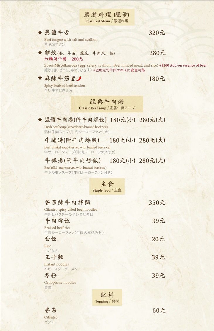 追求優質食材的原味,堅持選用台南溫體牛肉,並且湯底也都是以牛骨與多種蔬果熬製而成,鮮甜味美,令人難忘!店內多樣品項,都是嘔心瀝血之作,只為了將最好最美味的料理呈現在大眾眼前,推廣台南在地有名的美食-溫體牛肉湯,讓來往的饕客,都可以享受到最道地的佳餚!