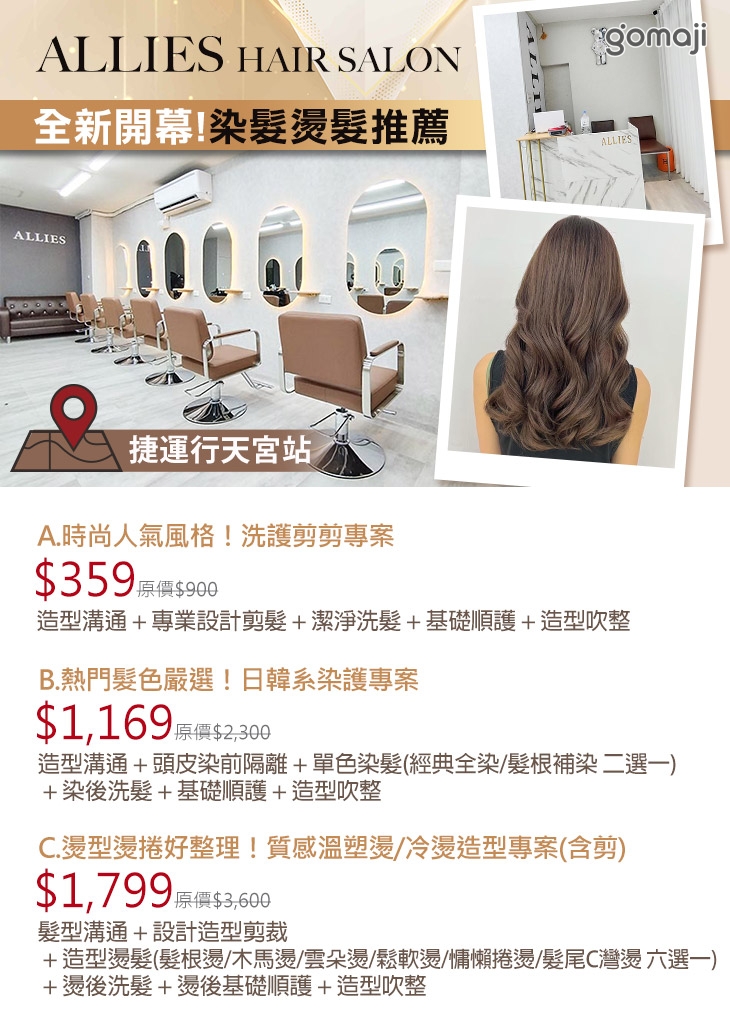 A.時尚人氣風格!洗護剪髮專案 / B.熱門髮色嚴選!日韓系染護專案 / C.燙型燙捲好整理!質感溫塑燙/冷燙造型專案(含剪)