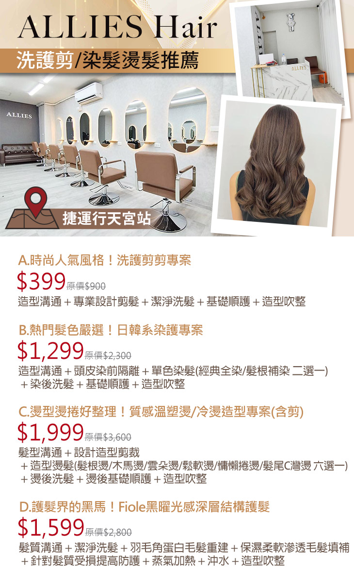 A.時尚人氣風格!洗護剪剪專案 / B.熱門髮色嚴選!日韓系染護專案 / C.燙型燙捲好整理!質感溫塑燙/冷燙造型專案(含剪) / D.護髮界的黑馬!Fiole黑曜光感深層結構護髮