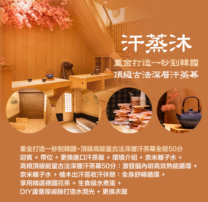 〈迎賓 + 帶位 + 更換進口汗蒸服 + 環境介紹 + 奈米離子水 + 高規頂級能量古法深層汗蒸幕50分:激發腦內啡高效熱能循環 + 奈米離子水 + 檜木出汗區收汗休憩:全身舒暢循環 + 享用精選德國花茶 + 生食級水煮蛋 + DIY蘆薈厚膚臉打造水潤光 + 更換衣服〉