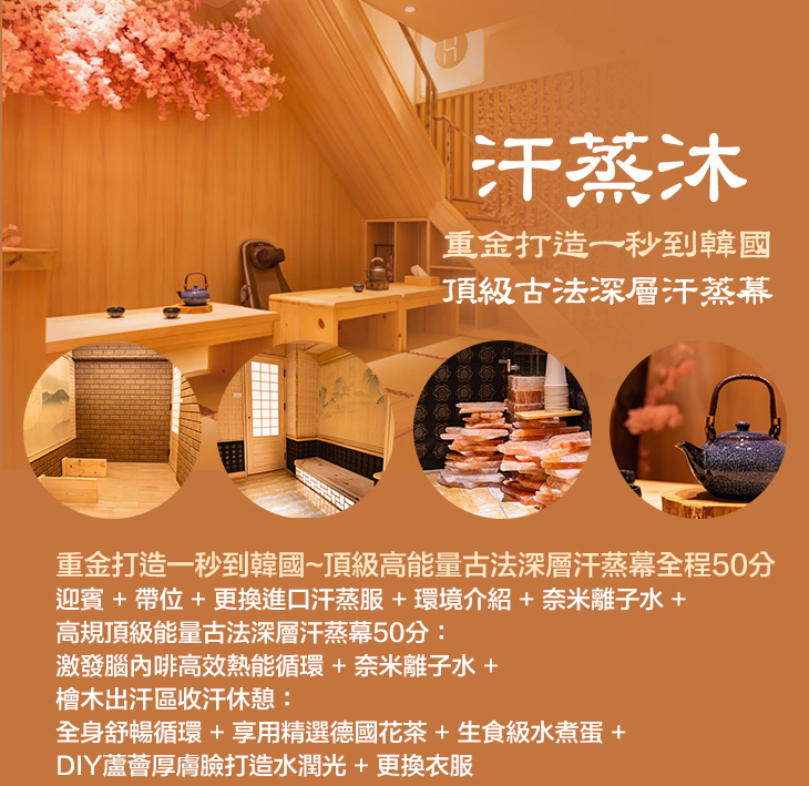 〈迎賓 + 帶位 + 更換進口汗蒸服 + 環境介紹 + 奈米離子水 + 高規頂級能量古法深層汗蒸幕50分:激發腦內啡高效熱能循環 + 奈米離子水 + 檜木出汗區收汗休憩:全身舒暢循環 + 享用精選德國花茶 + 生食級水煮蛋 + DIY蘆薈厚膚臉打造水潤光 + 更換衣服〉