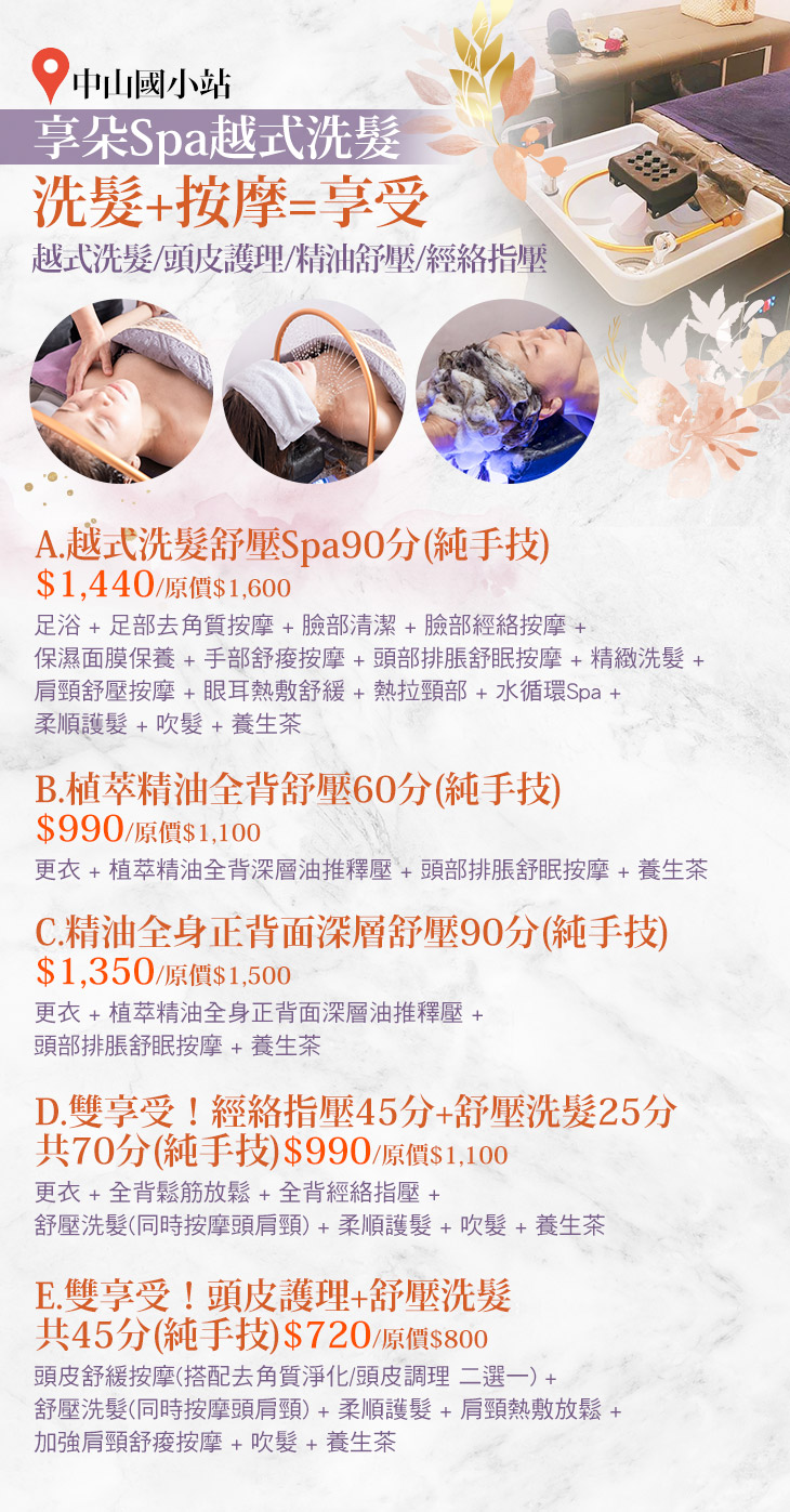 A.越式洗髮舒壓Spa90分(純手技) / B.植萃精油全背舒壓60分(純手技) / C.精油全身正背面深層舒壓90分(純手技) / D.雙享受!經絡指壓45分+舒壓洗髮25分共70分(純手技) / E.雙享受!頭皮護理+舒壓洗髮共45分(純手技)