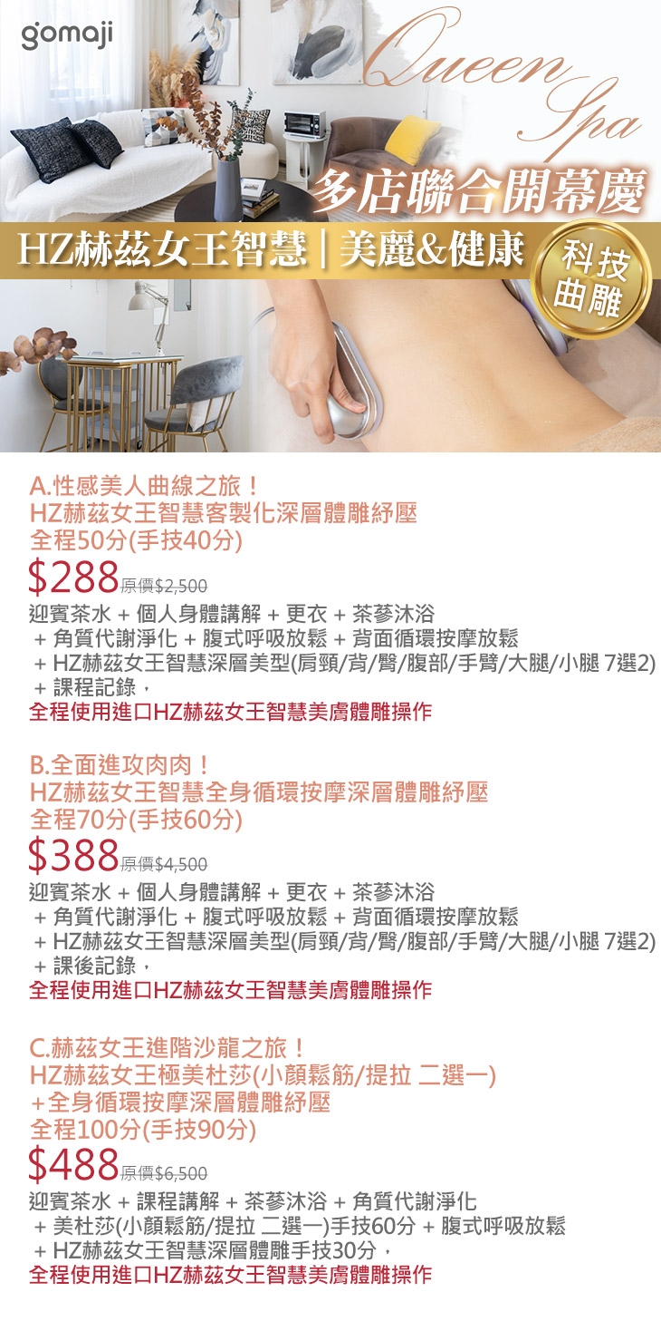 A.性感美人曲線之旅!HZ赫茲女王智慧客製化深層體雕紓壓全程50分(手技40分) / B.全面進攻肉肉!HZ赫茲女王智慧全身循環按摩深層體雕紓壓全程70分(手技60分) / C.赫茲女王進階沙龍之旅!HZ赫茲女王極美杜莎(小顏鬆筋/提拉 二選一)+全身循環按摩深層體雕紓壓全程100分(手技90分)