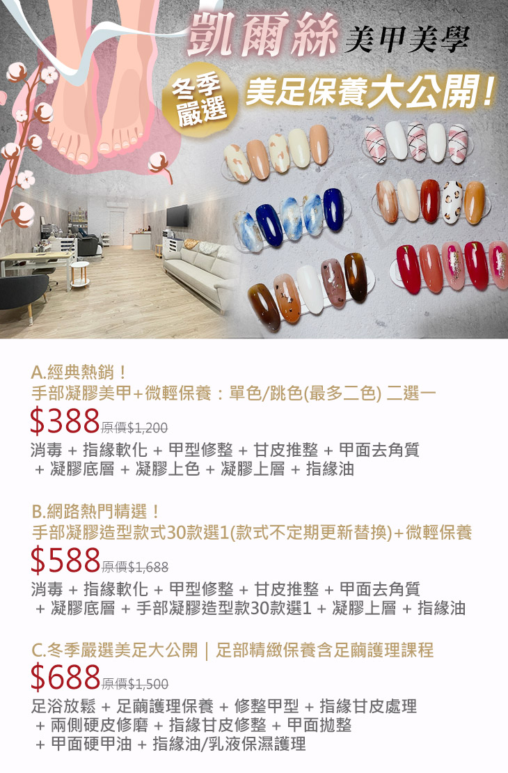 A.經典熱銷!手部凝膠美甲+微輕保養:單色/跳色(最多二色) 二選一 / B.網路熱門精選!手部凝膠造型款式30款選1(款式不定期更新替換)+微輕保養 /C.冬季嚴選美足大公開|足部精緻保養含足繭護理課程