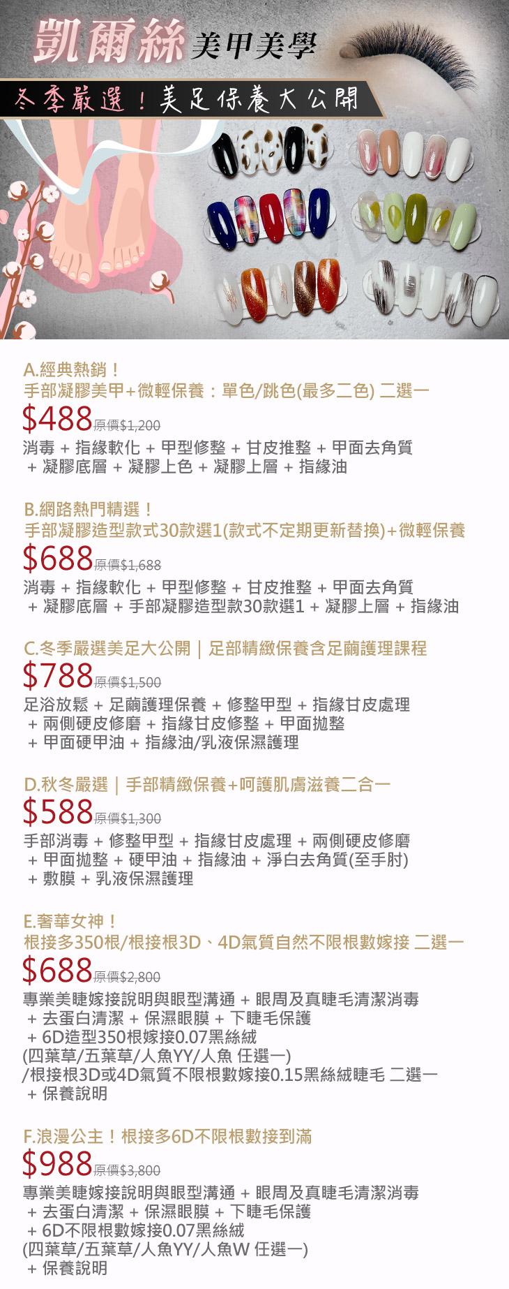 A.經典熱銷!手部凝膠美甲+微輕保養:單色/跳色(最多二色) 二選一 / B.網路熱門精選!手部凝膠造型款式30款選1(款式不定期更新替換)+微輕保養 / C.冬季嚴選美足大公開|足部精緻保養含足繭護理課程 / D.秋冬嚴選|手部精緻保養+呵護肌膚滋養二合一 / E.奢華女神!根接多350根/根接根3D、4D氣質自然不限根數嫁接 二選一 / F.浪漫公主!根接多6D不限根數接到滿