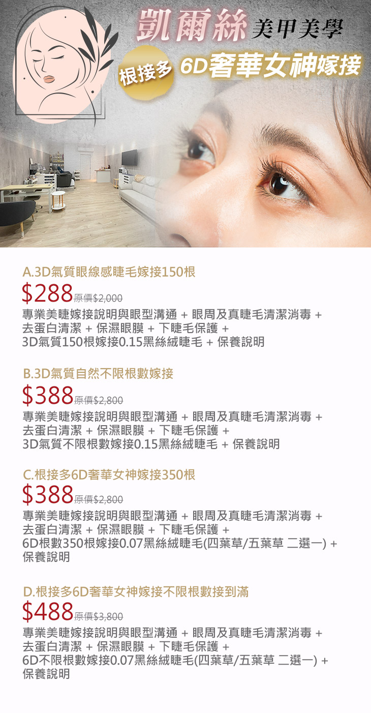 A.3D氣質眼線感睫毛嫁接150根 / B.3D氣質自然不限根數嫁接 / C.根接多6D奢華女神嫁接350根 / D.根接多6D奢華女神嫁接不限根數接到滿