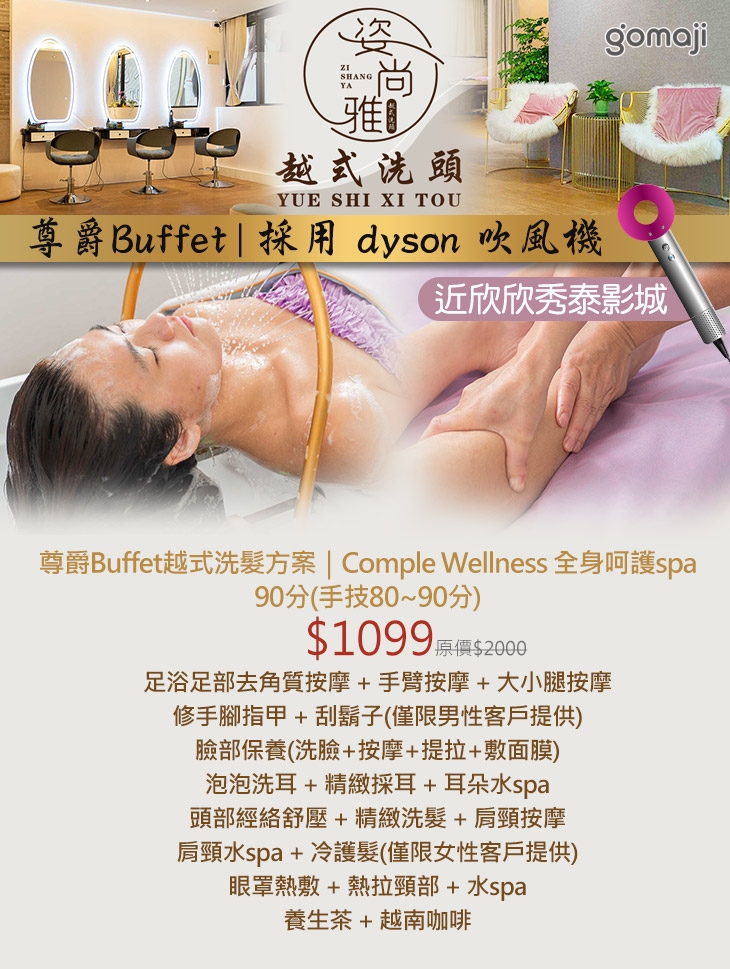 ★ 尊爵Buffet越式洗髮方案|Comple Wellness 全身呵護spa90分(手技80~90分)