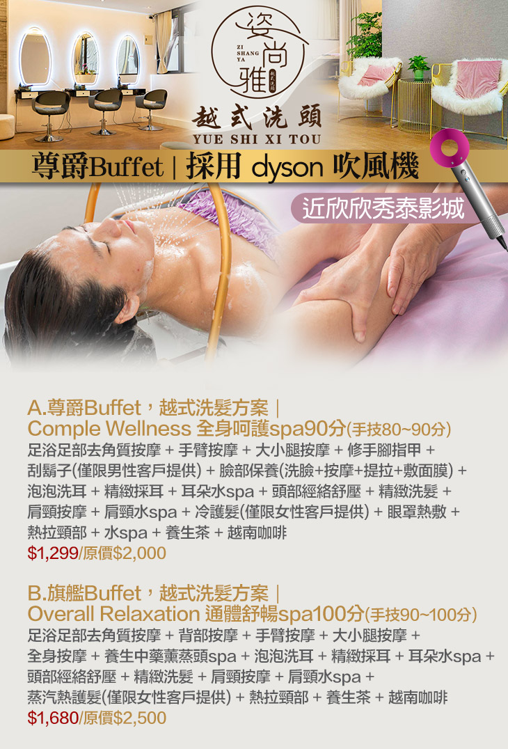 ★ A.尊爵Buffet,越式洗髮方案|Comple Wellness 全身呵護spa90分(手技80~90分)