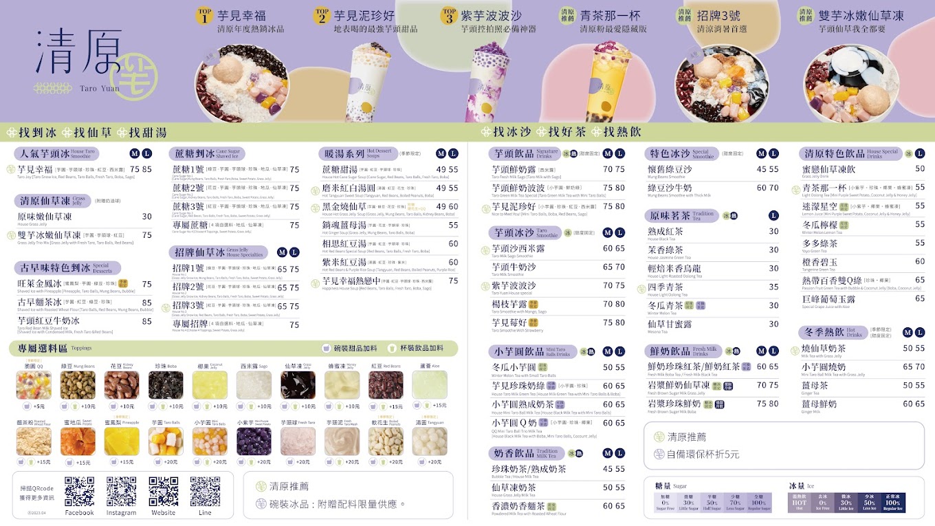【清原芋圓】以上等優質的芋頭做為招牌,打造出一系列的厲害用料,從有名的九份芋圓取經,經過多年研發,創造出Q軟彈嫩的好芋圓!不管是大芋圓、小芋圓、還是專利小紫芋,都是非常美味、好吃的!而且不只能在清原喝到芋頭系列相關飲品,還可以喝到不同的沁涼飲料、招牌冰品、冬季熱飲、暖心甜湯,一年四季都可以滿足饕客的味蕾,讓你不論冰熱通通都能嚐到!