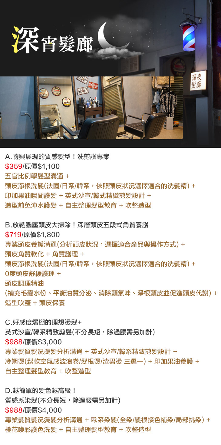 下班後總是找不到一間好的髮廊可以洗頭、剪頭髮還有做染燙呢?別擔心,現在有【深宵髮廊】來為你服務!復古的裝潢配上工業風,乾淨特別的髮廊,讓你在下班後可以來個放鬆的剪髮之旅,所有服務,將由專業的髮型設計師來幫你,將髮型的細節處理的很細緻,只為給你一個完美、亮麗的好髮型,讓你可以煥然一新!這樣一間時間與CP值都符合你要求的髮廊,怎麼能不約起來呢!
